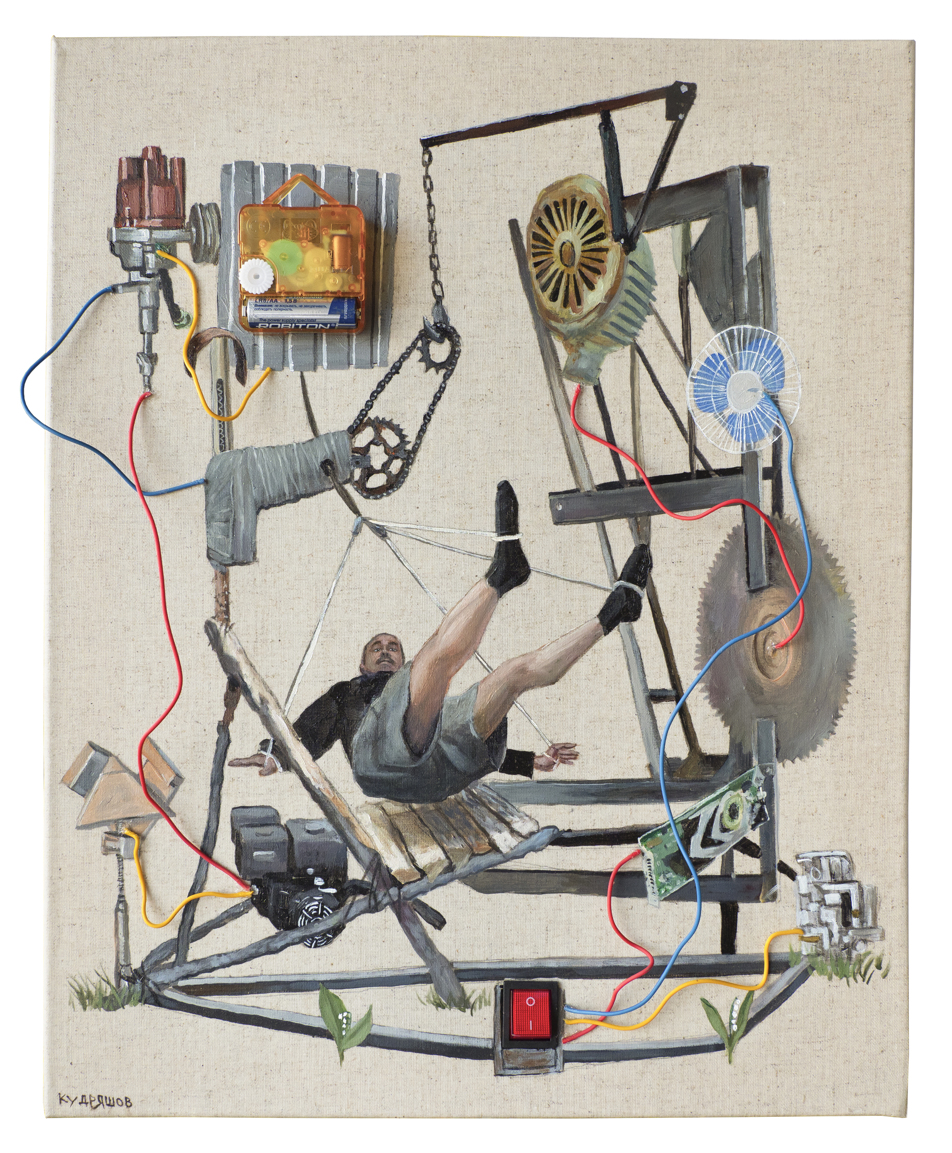 холст, акрил, масло, выключатель, часовой механизм, провода, 40х50