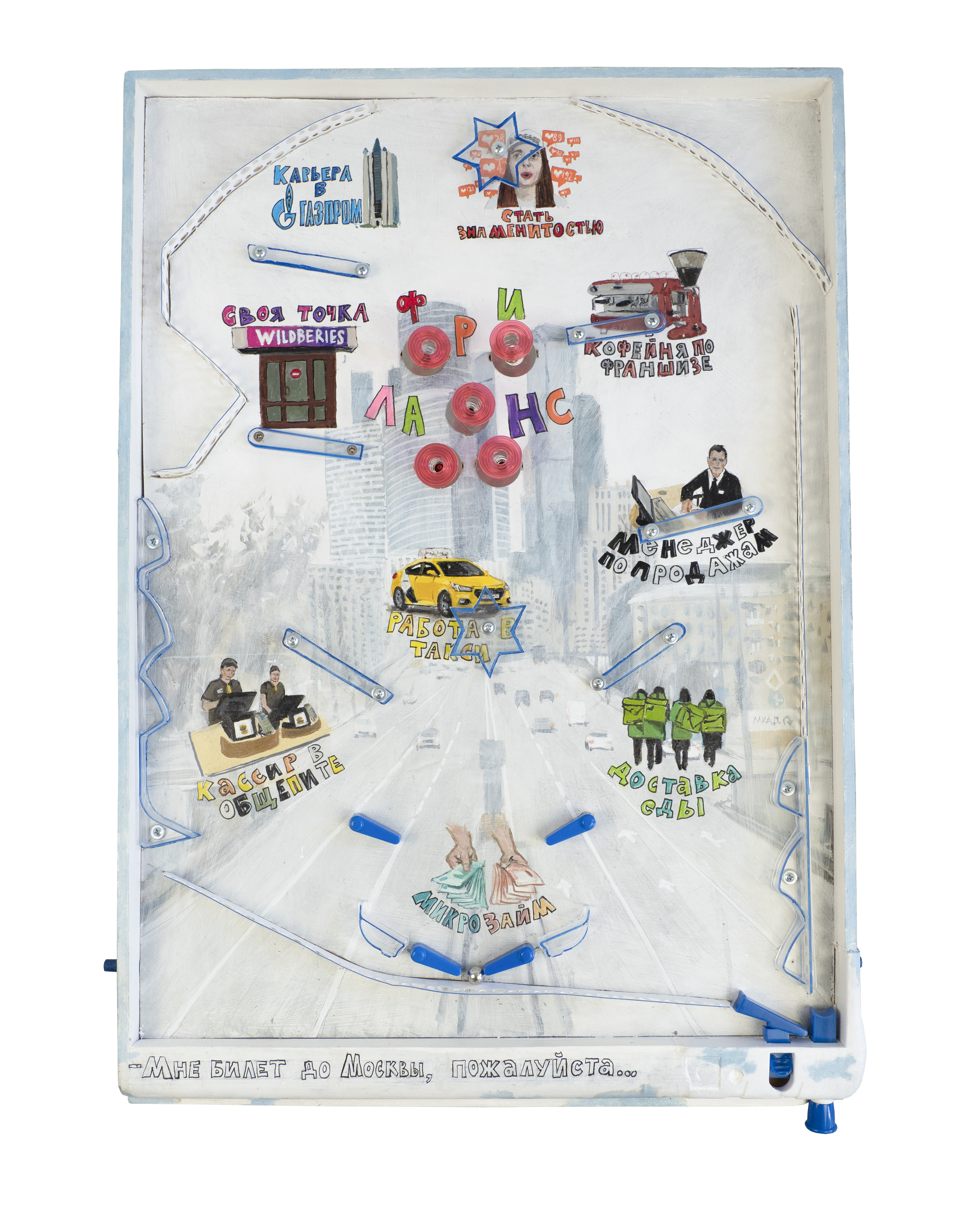 пинбол, арт-объект с авторской конструкцией и ручной росписью в коллаборации с Михаилом Чуловым, 68х47х18
